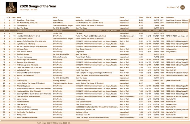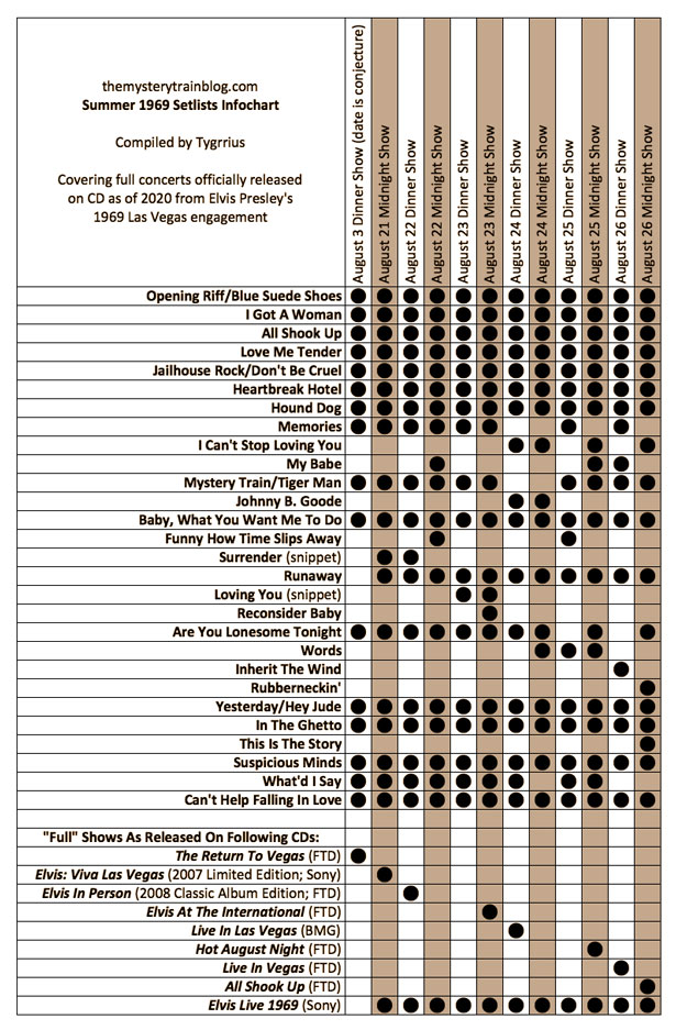 2The playlist I created on Spotify is not an exact duplicate of the intended playlist due to multiple compromises around track availability, splitting of tracks, extraneous content (Elvis introducing the next song at the tail end of a live track rather than at the start of the track it actually belongs, a pet peeve of mine; exacerbated in this playlist due to the next song being something different).↩︎