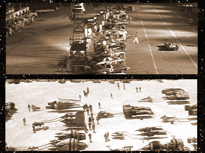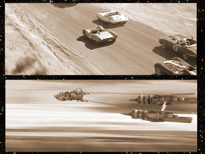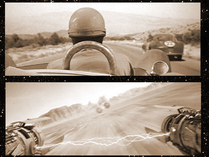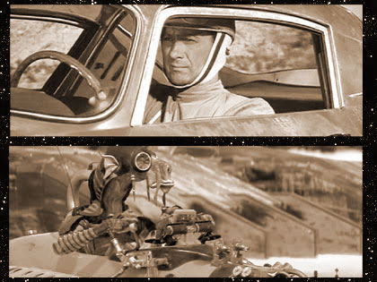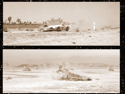 In his silver and blue racecar, Elvis concentrates as the race across the desert begins.